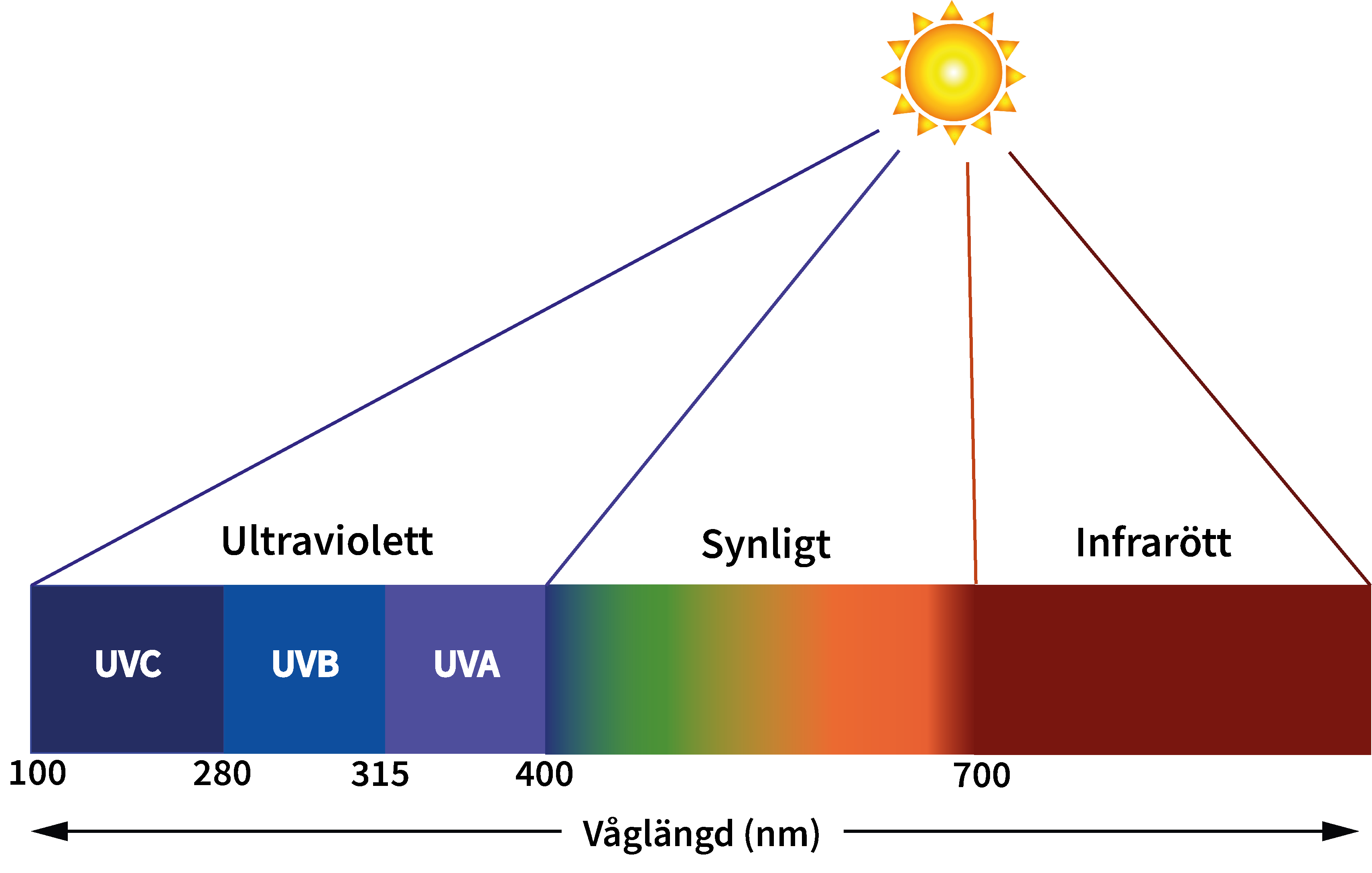 Ultraviolett strålning (UV-ljus) finns i det elektromagnetiska ljusspektrumet med kortare våglängder än synligt ljus; våglängder, λ ≈ 100-400 nm.